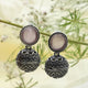 A beautiful fusion of vintage charm and modern elegance, these oxidised silver-plated earrings feature a mesmerizing pink cat’s eye stone at the stud, gracefully leading to an intricately carved dome-shaped dangler.