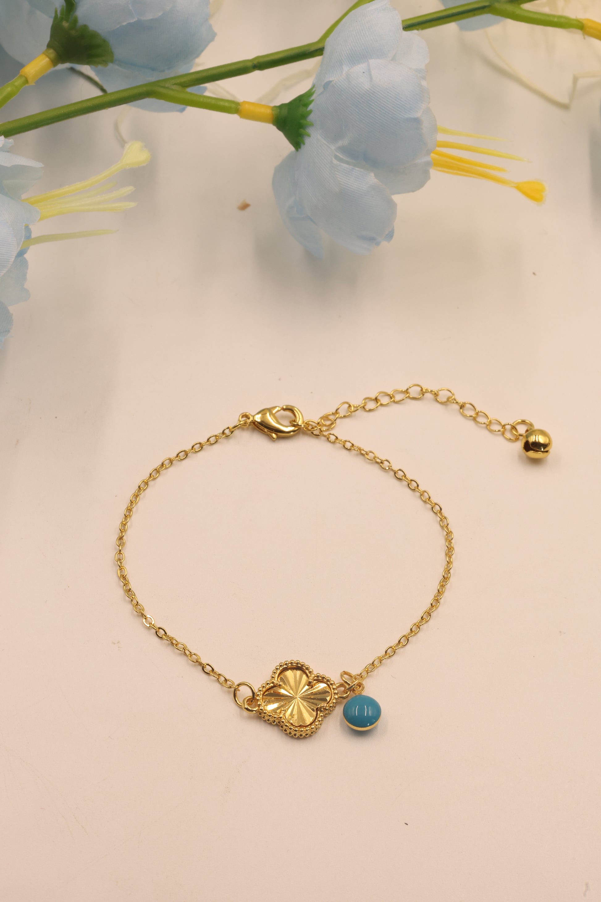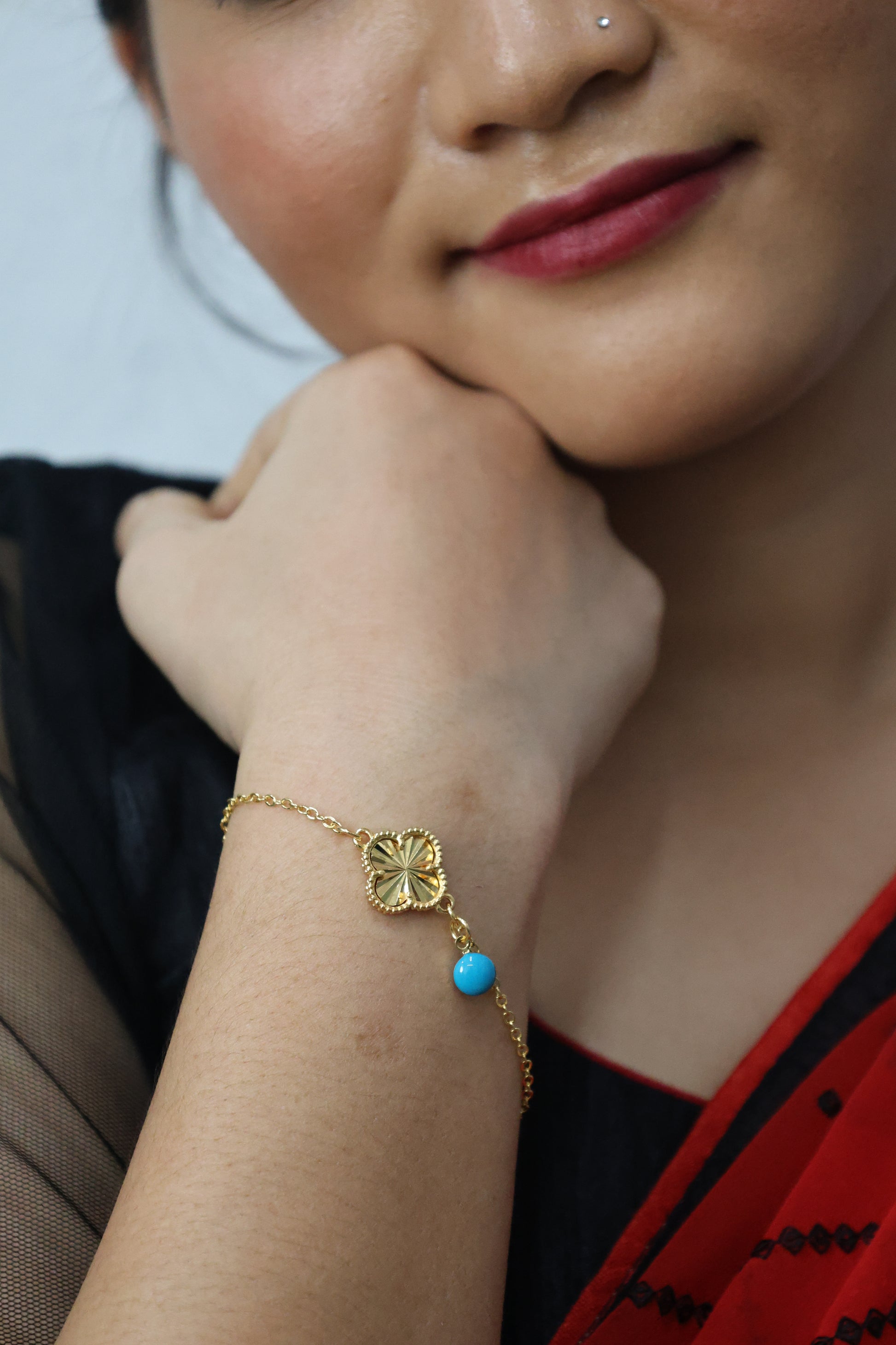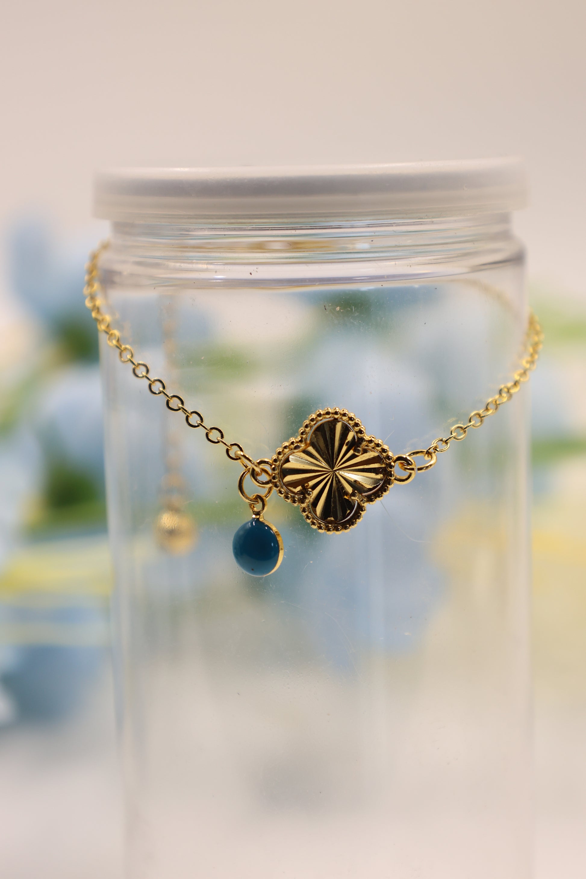 Delicately crafted, the Charm Clover Bracelet exudes timeless appeal with its elegant gold-toned clover centerpiece and striking blue bead accent. Symbolizing luck and passion, this bracelet seamlessly blends traditional motifs with a modern silhouette.
