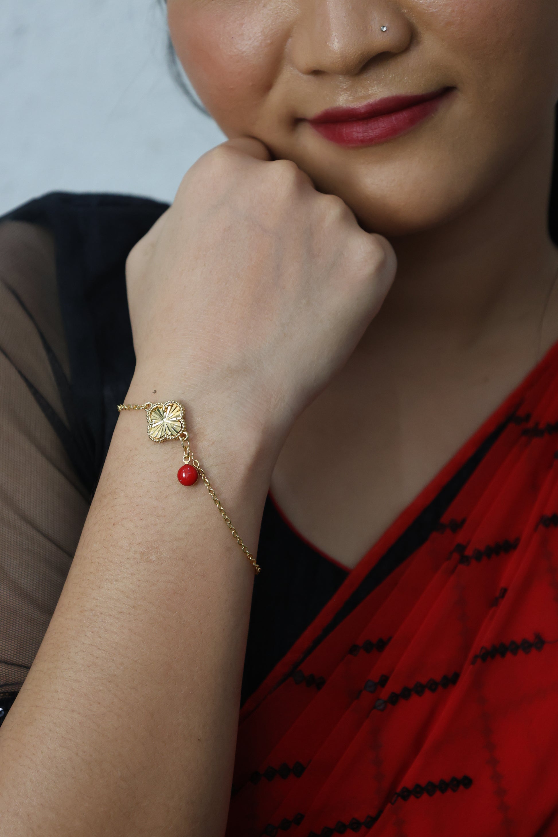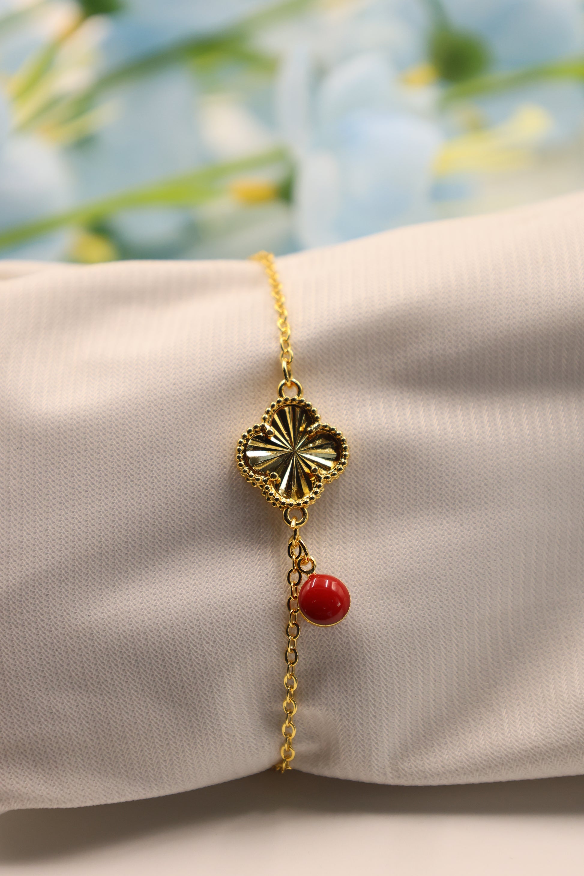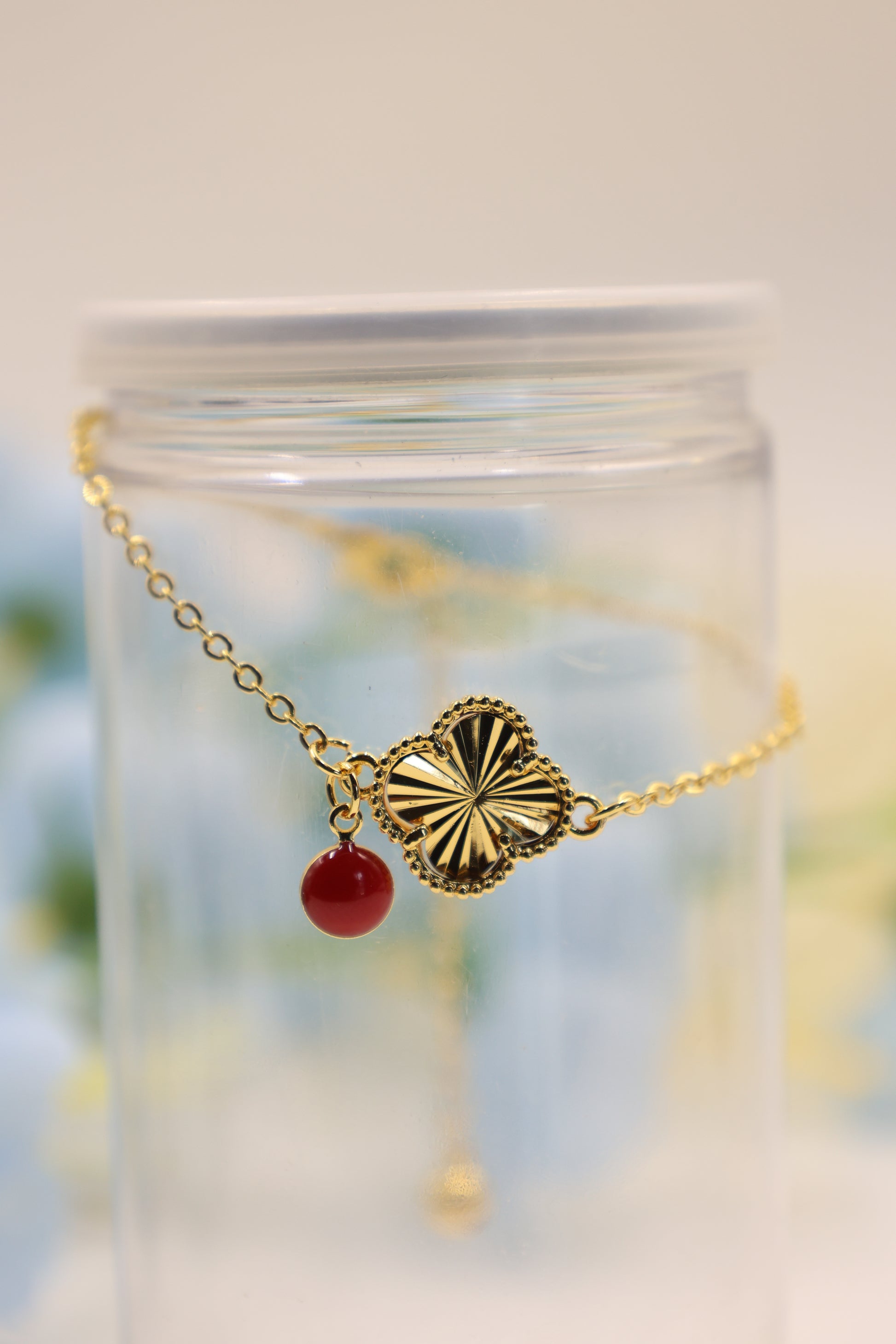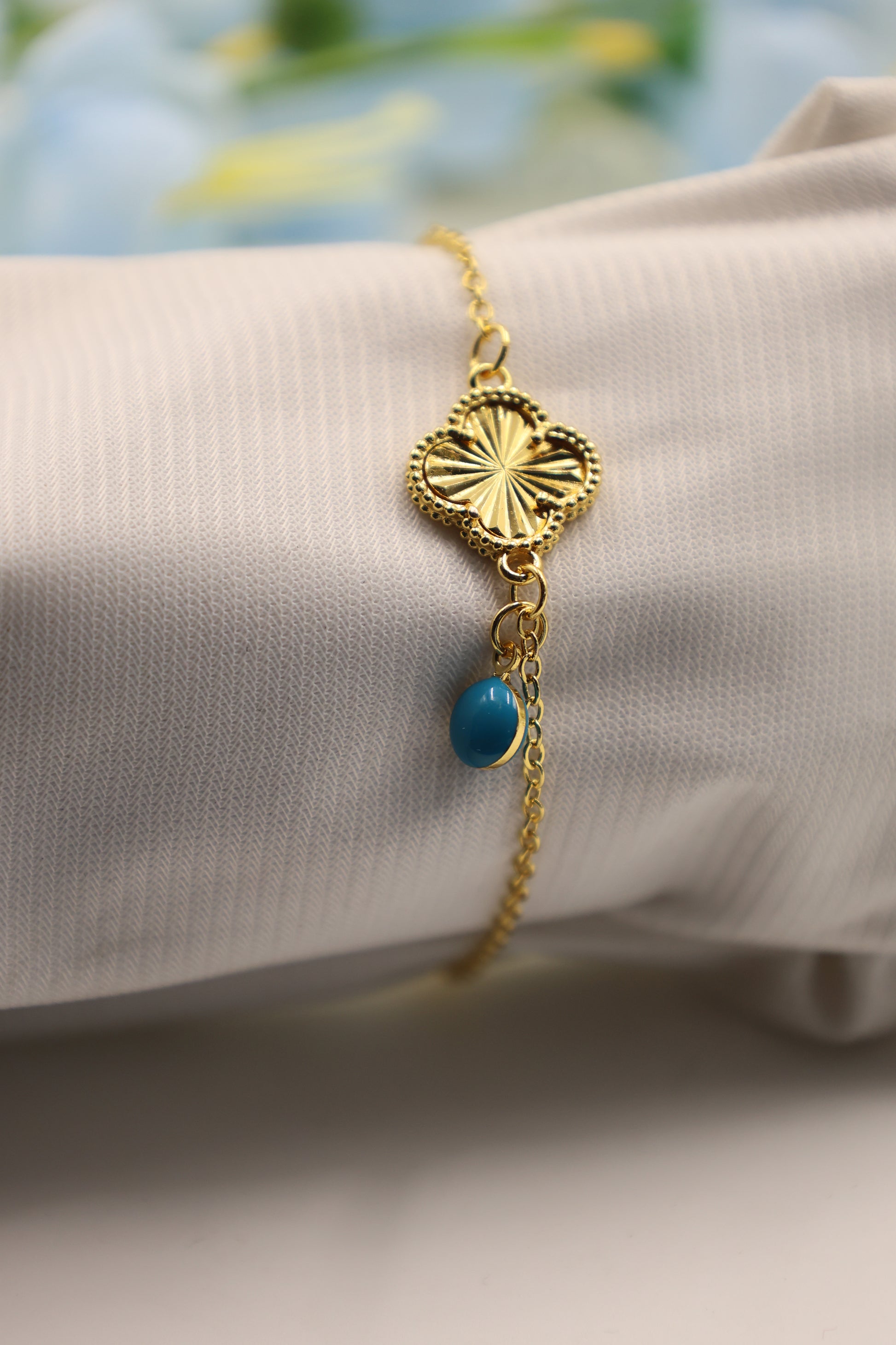 Delicately crafted, the Charm Clover Bracelet exudes timeless appeal with its elegant gold-toned clover centerpiece and striking blue bead accent. Symbolizing luck and passion, this bracelet seamlessly blends traditional motifs with a modern silhouette.