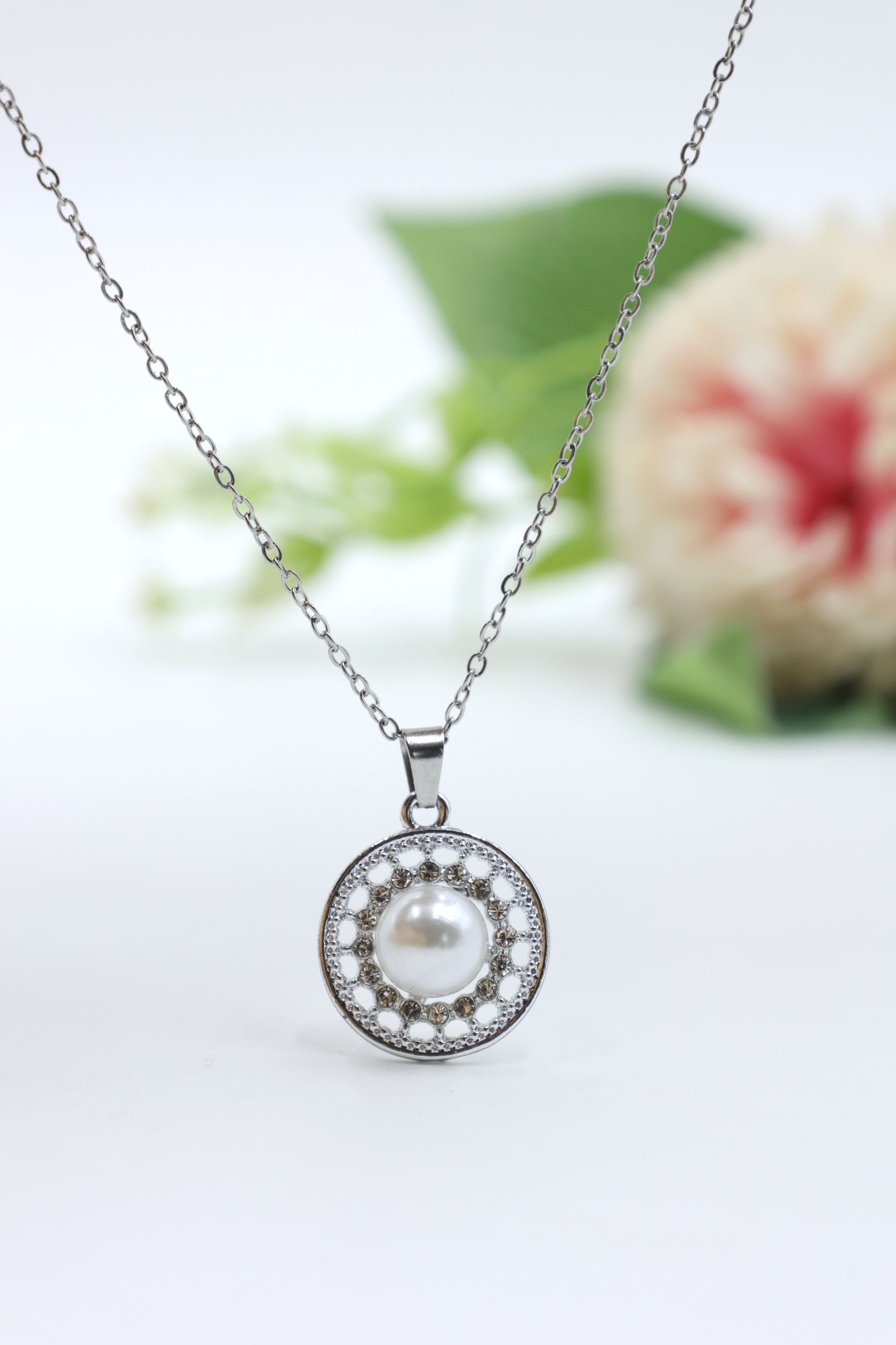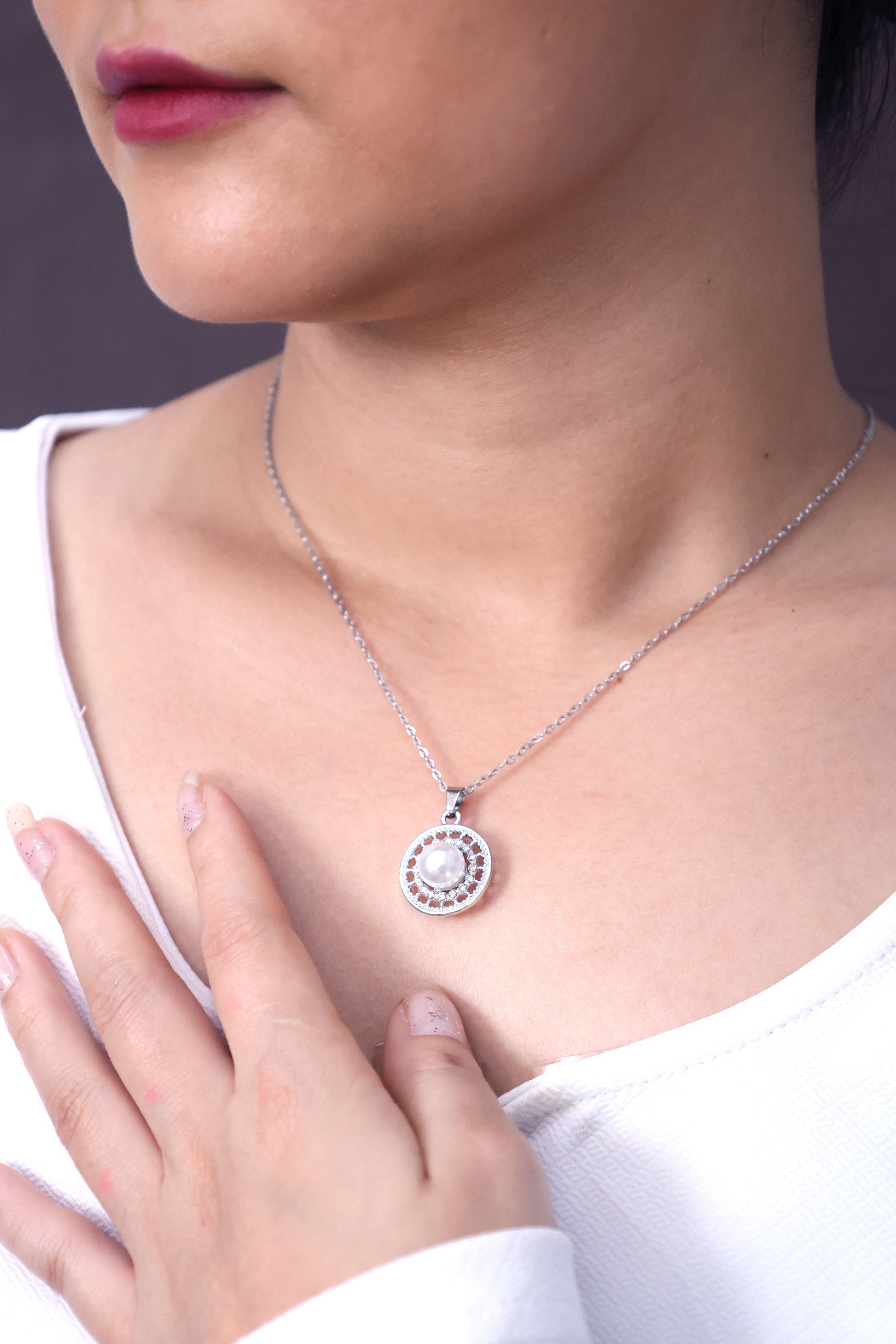 Elevate your style with the Classic Pearl Elegance Pendant Necklace, a symbol of grace and sophistication. The lustrous faux pearl at the center is encircled by a halo of sparkling CZ stones, adding a touch of vintage charm.