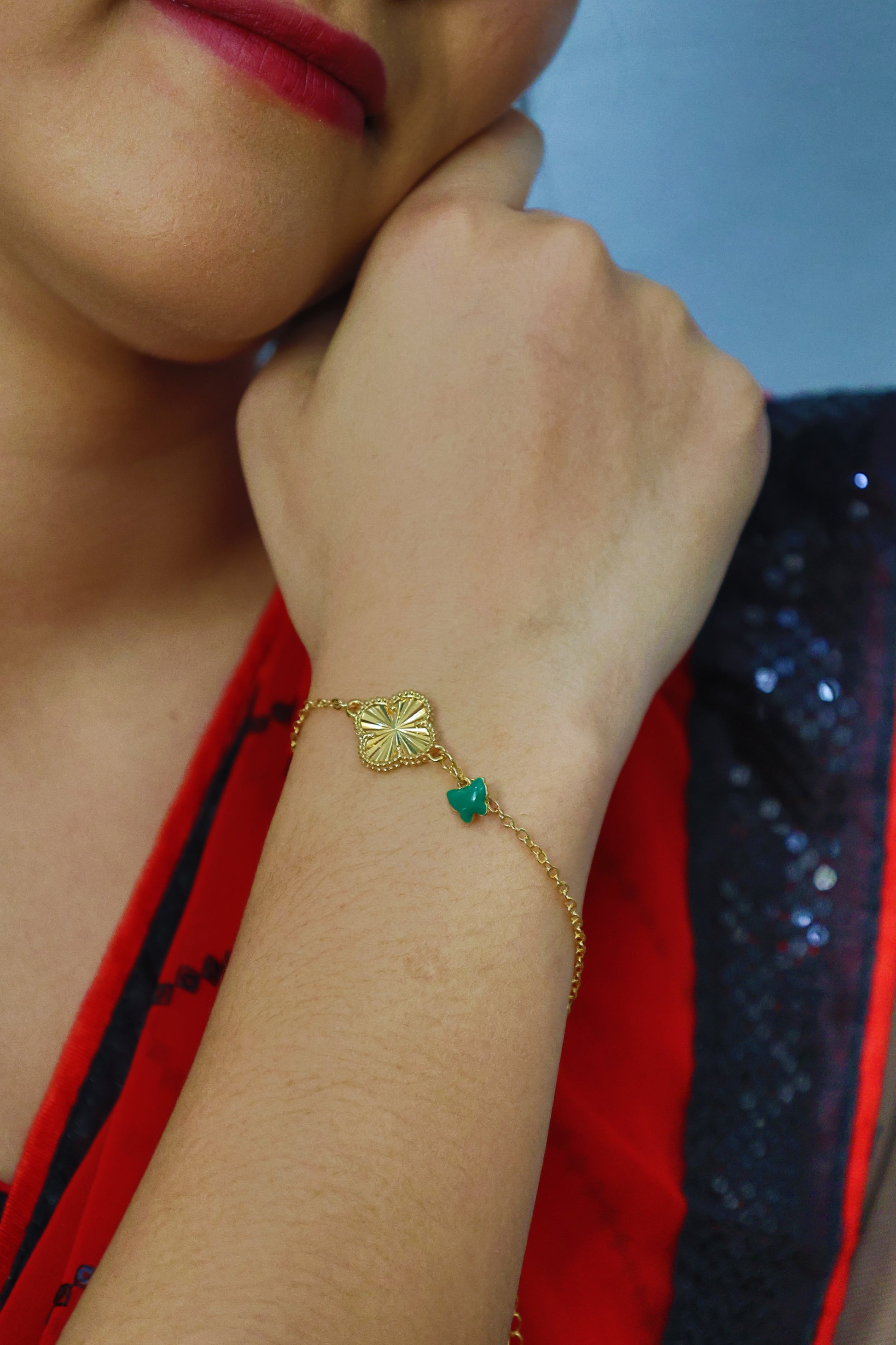 Celebrate charm and grace with the Emerald Bloom Clover Bracelet, a delicate gold-plated piece adorned with a... Read More