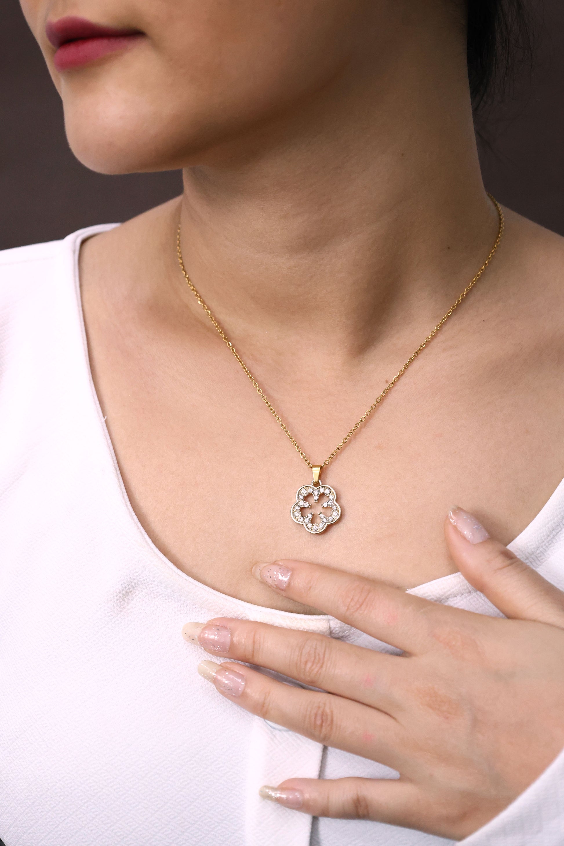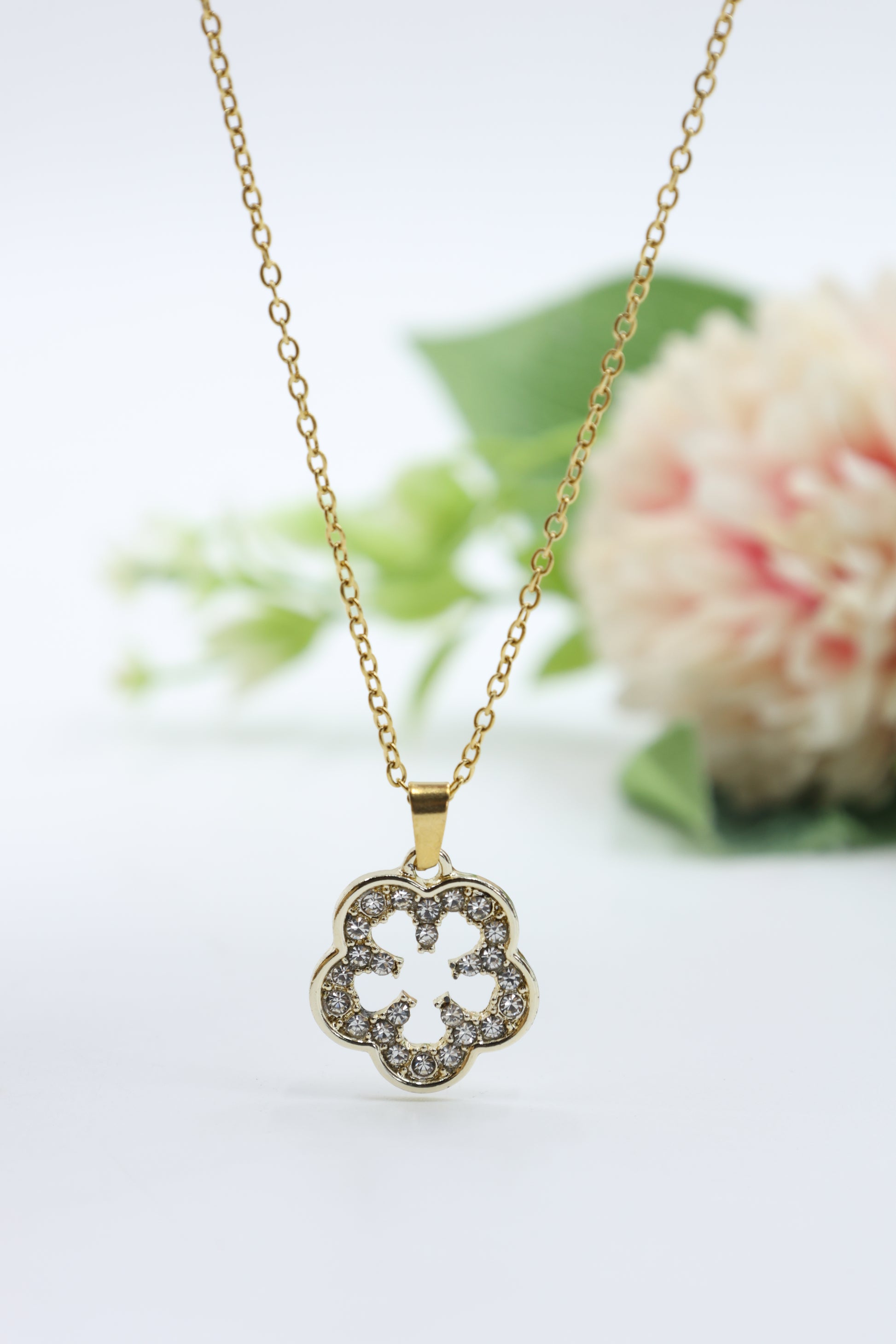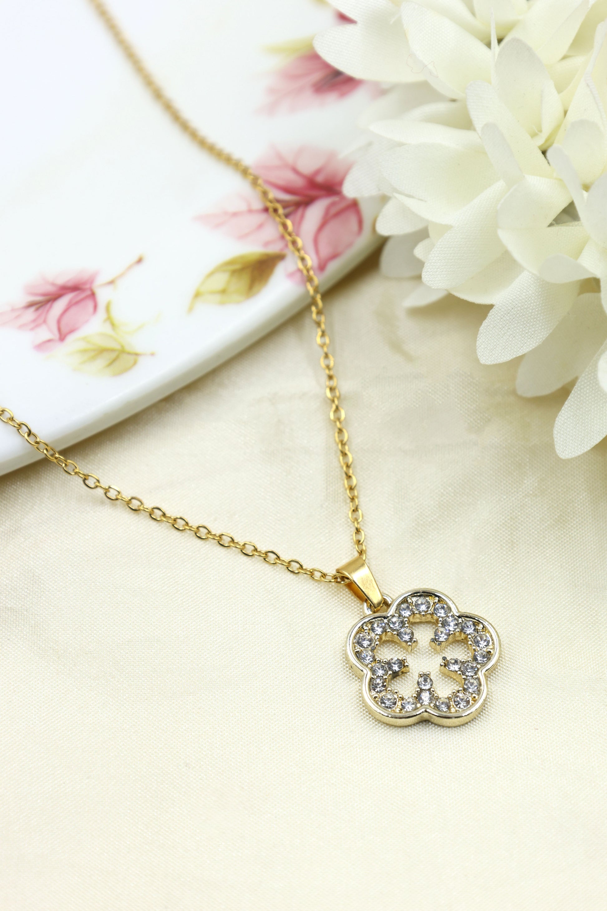Gold-Plated Floral Crystal Pendant Necklace is designed in a delicate clover-inspired shape, this pendant is adorned with brilliant clear crystals that catch the light beautifully.