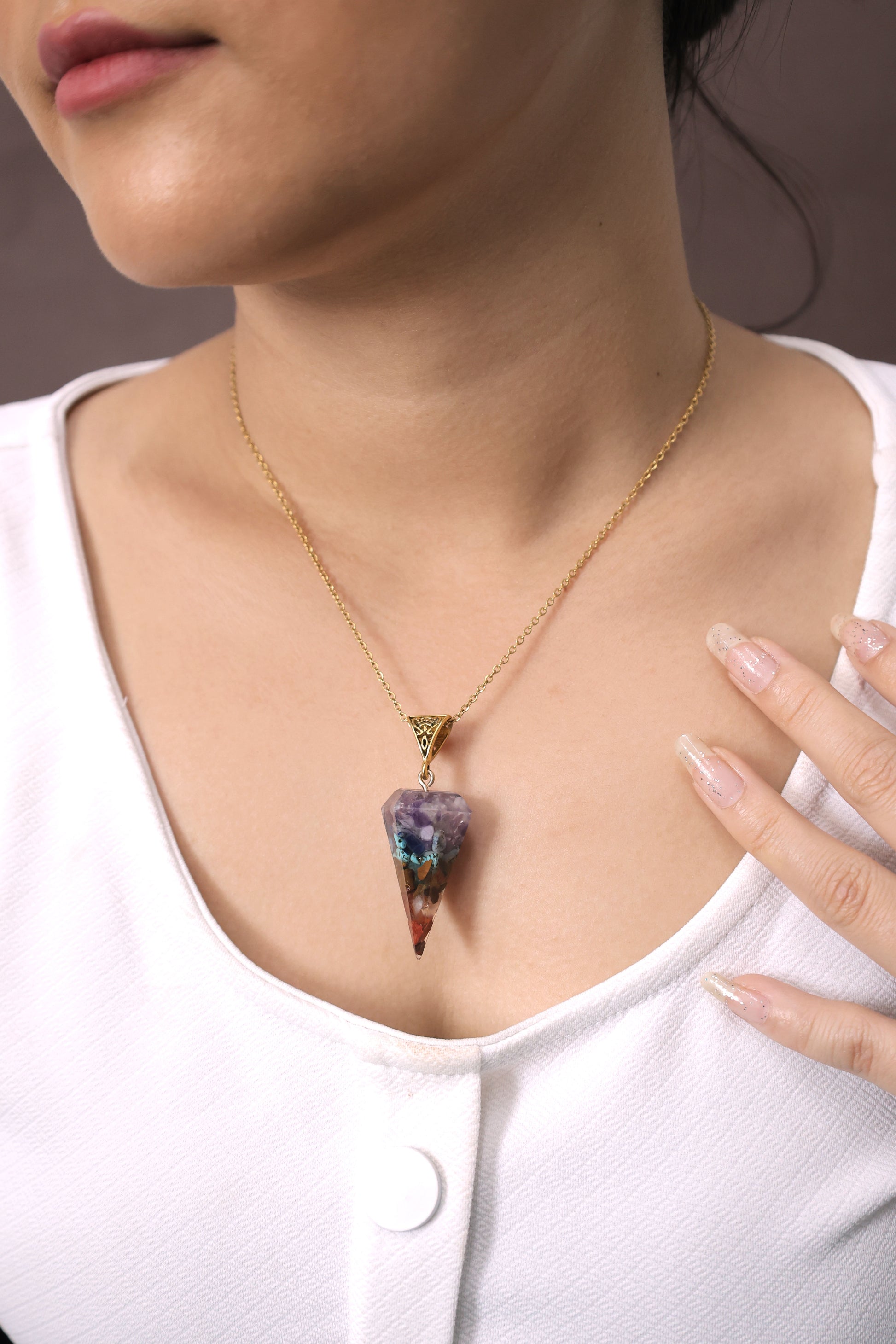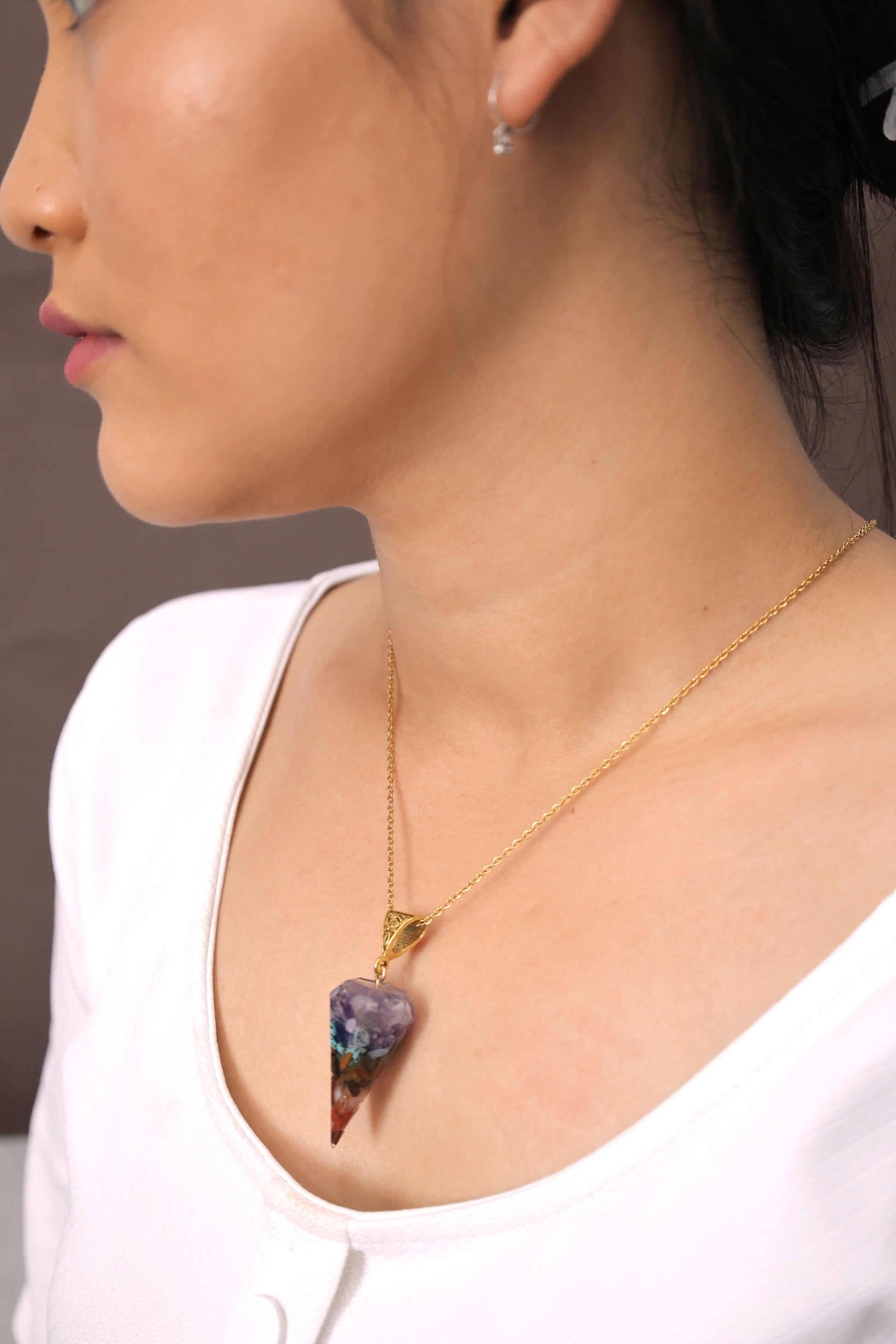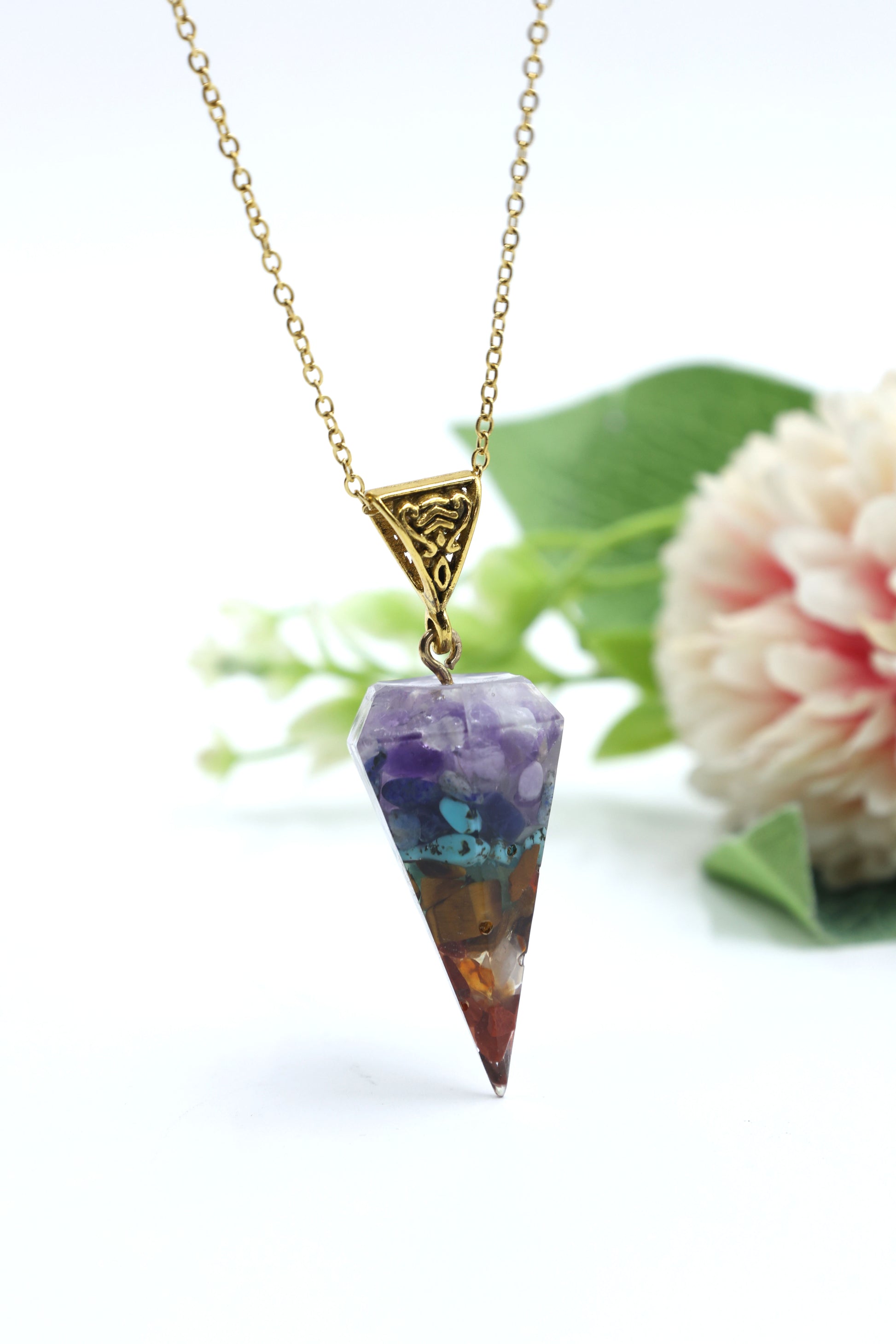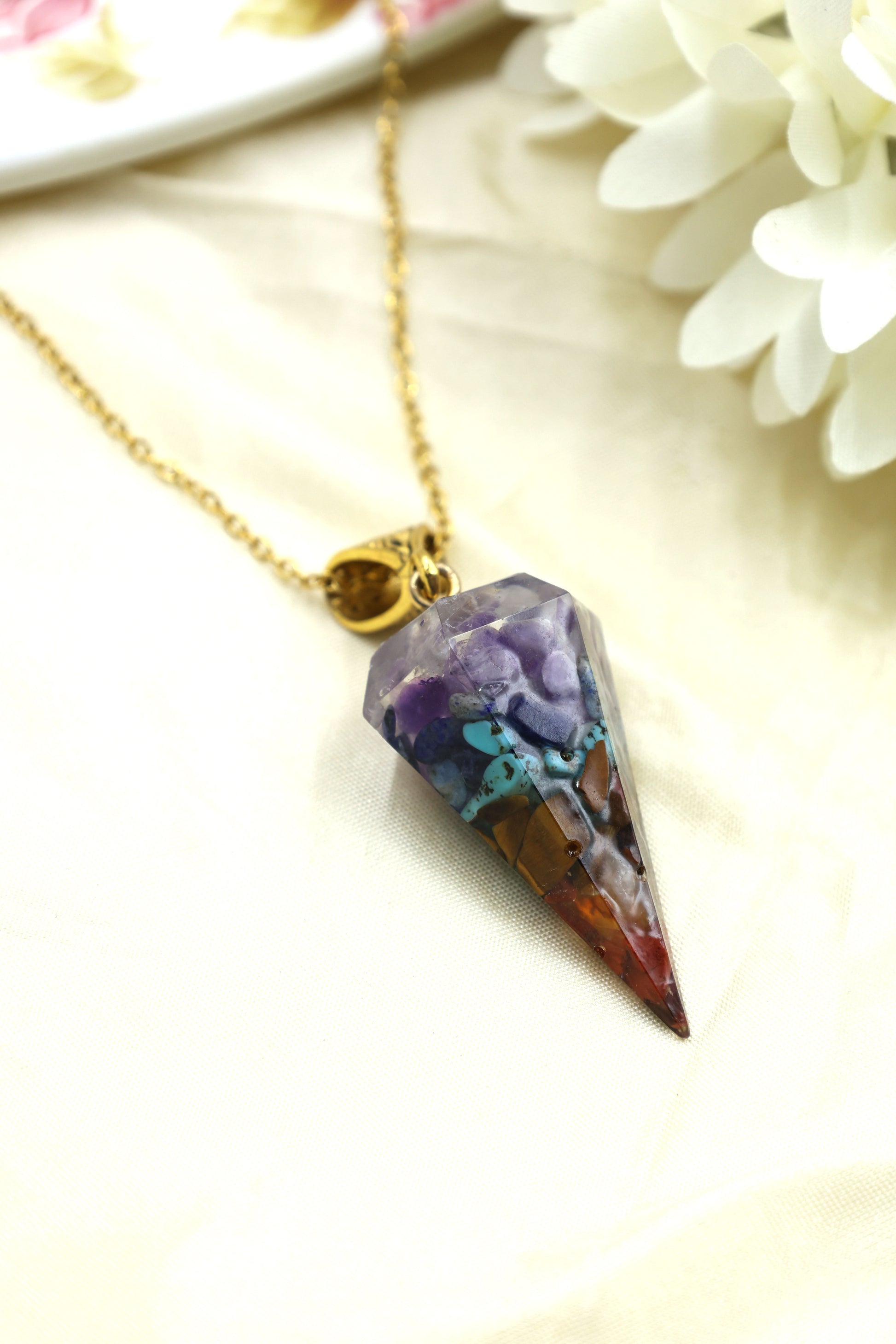 Elevate your accessory collection with this Layered Crystal Resin Pendant Necklace, designed for those who adore artistic and spiritual aesthetics. The pendant features a unique pyramid shape, infused with vibrant crystal chips embedded in high-quality resin, creating a mesmerizing layered effect.
