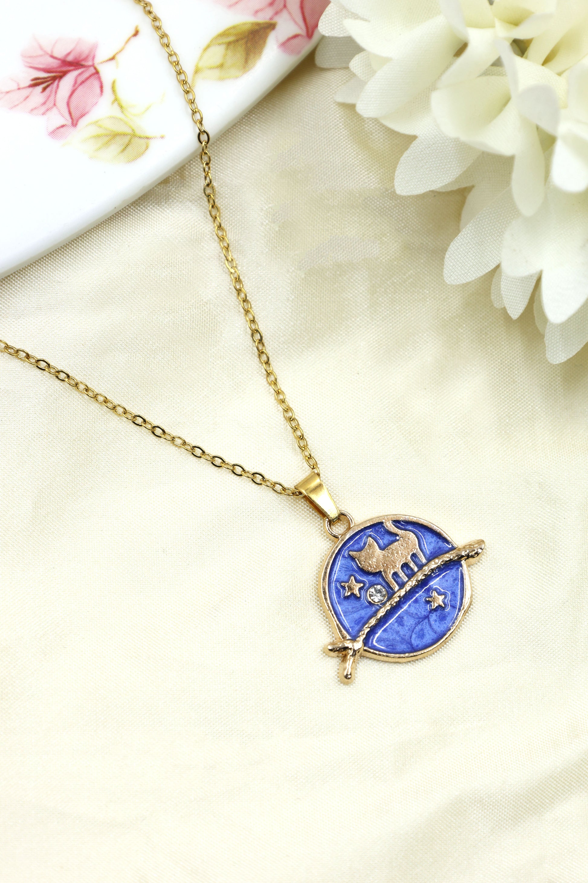 A dreamy blend of celestial beauty and feline charm, this Midnight Cat Pendant Necklace features an intricate gold-plated design against a deep blue enamel sky.
