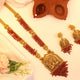 Set includes Gold plated stunning long necklace, a pair of earring with red beads with temple design ensuring fully coordinated traditional look.