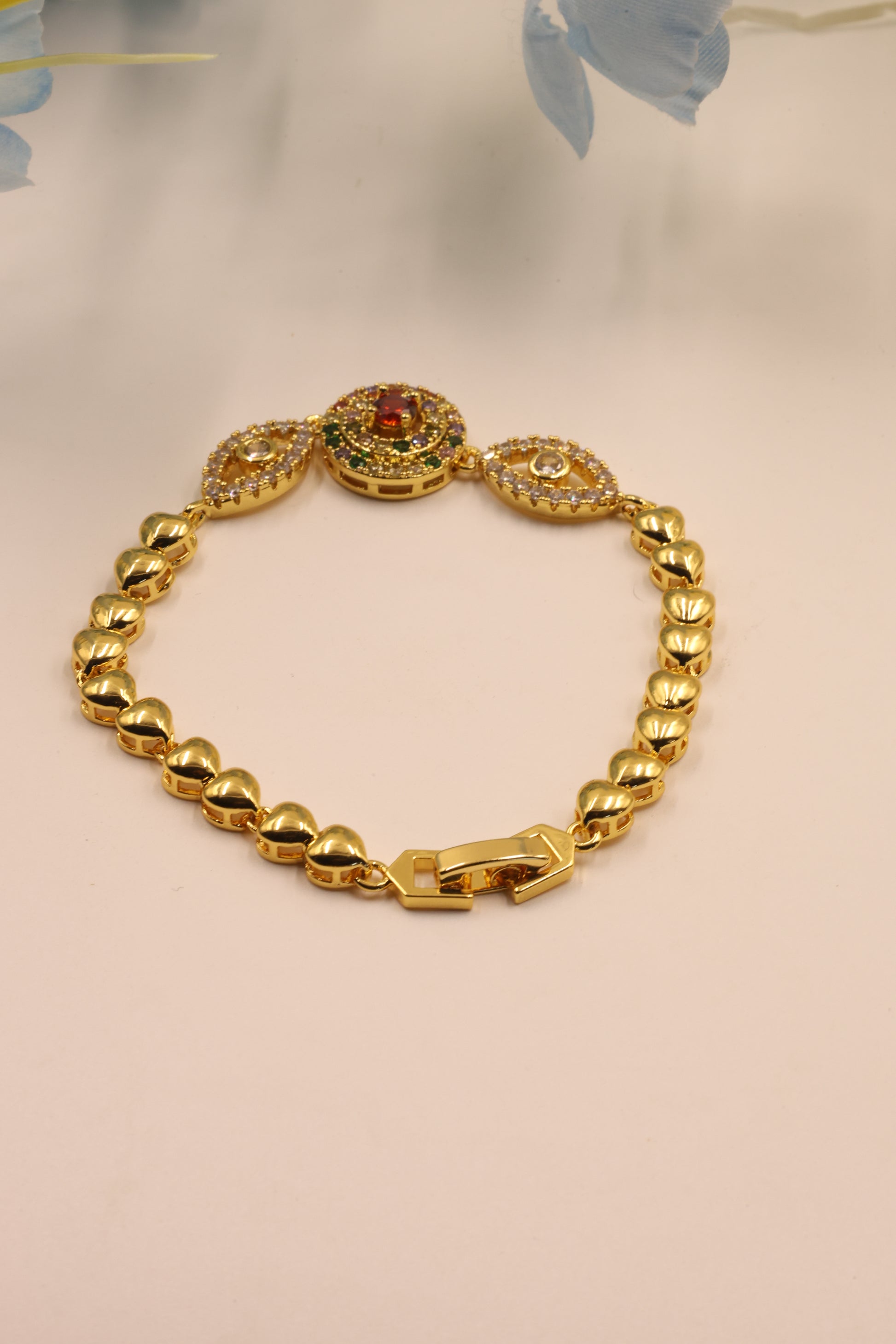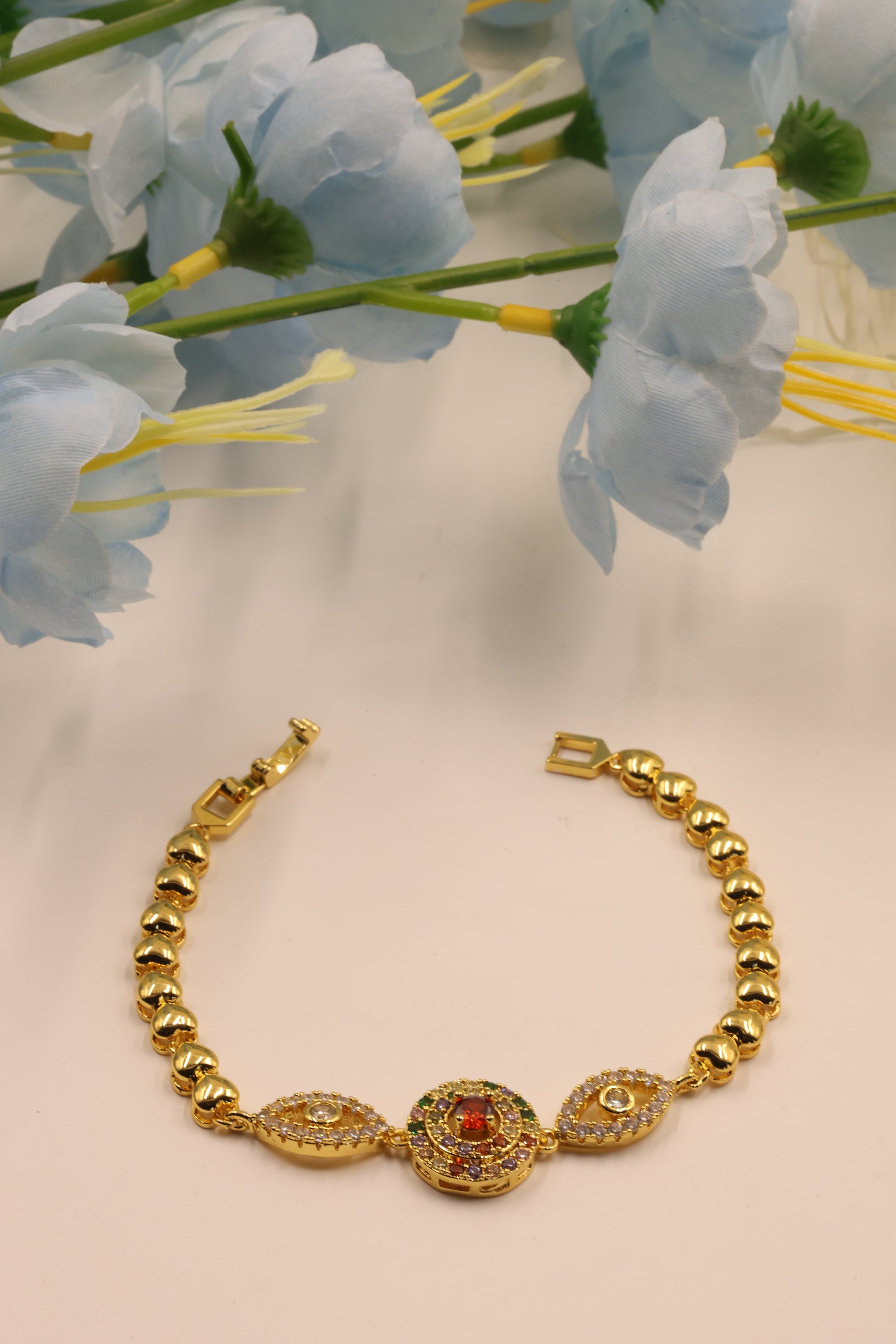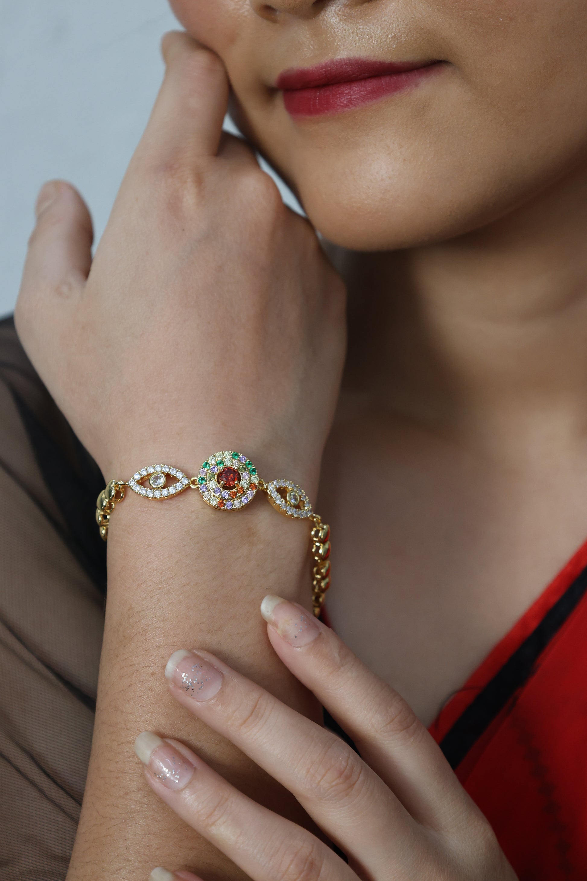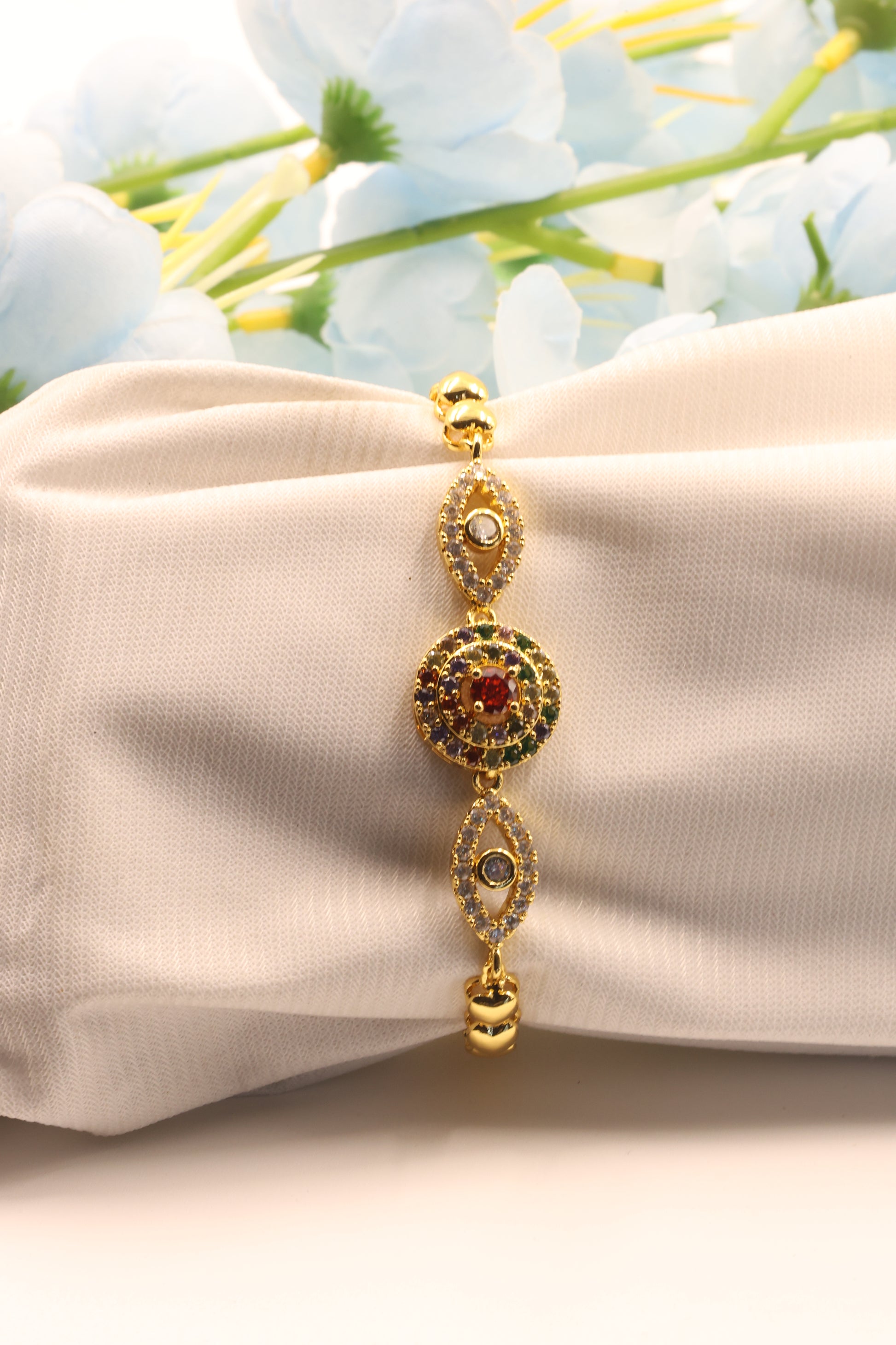 The Navratna Harmony Bracelet is a dazzling fusion of tradition and style. Featuring a central medallion adorned with Navratna stones surrounded by twin eye-shaped motifs encrusted with Cubic Zirconia, this bracelet embodies balance, beauty, and protection.