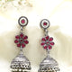 Elegant oxidized silver jhumka earrings featuring floral ruby-colored stones, pearl embellishments, and intricate carvings—perfect for adding a regal touch to any outfit.