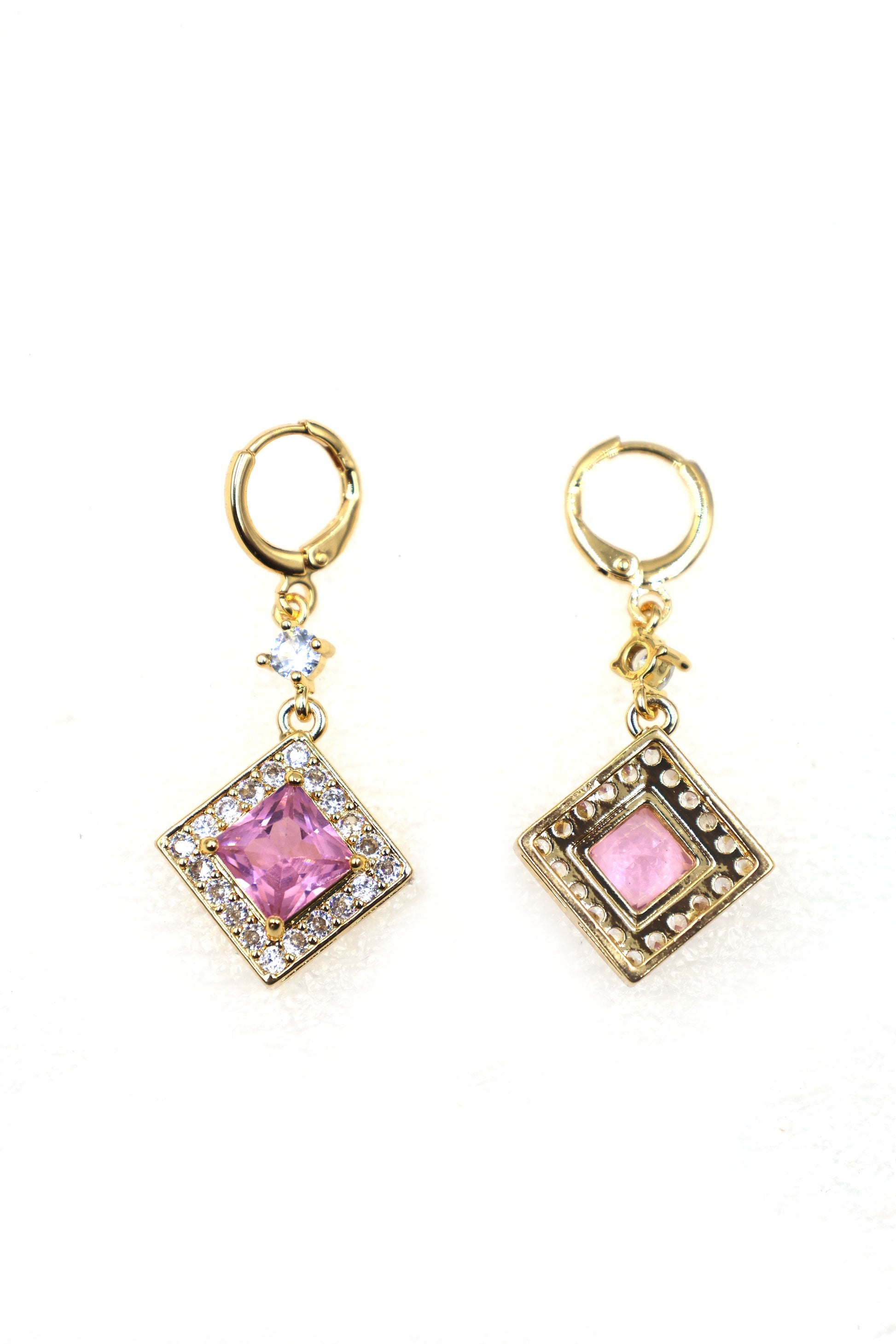 Crafted with exquisite detailing, these drop earrings feature a stunning princess-cut pink zircon stone, framed by a halo of sparkling clear CZ stones. The gold-plated finish adds a luxurious touch, making these earrings an elegant yet versatile accessory.